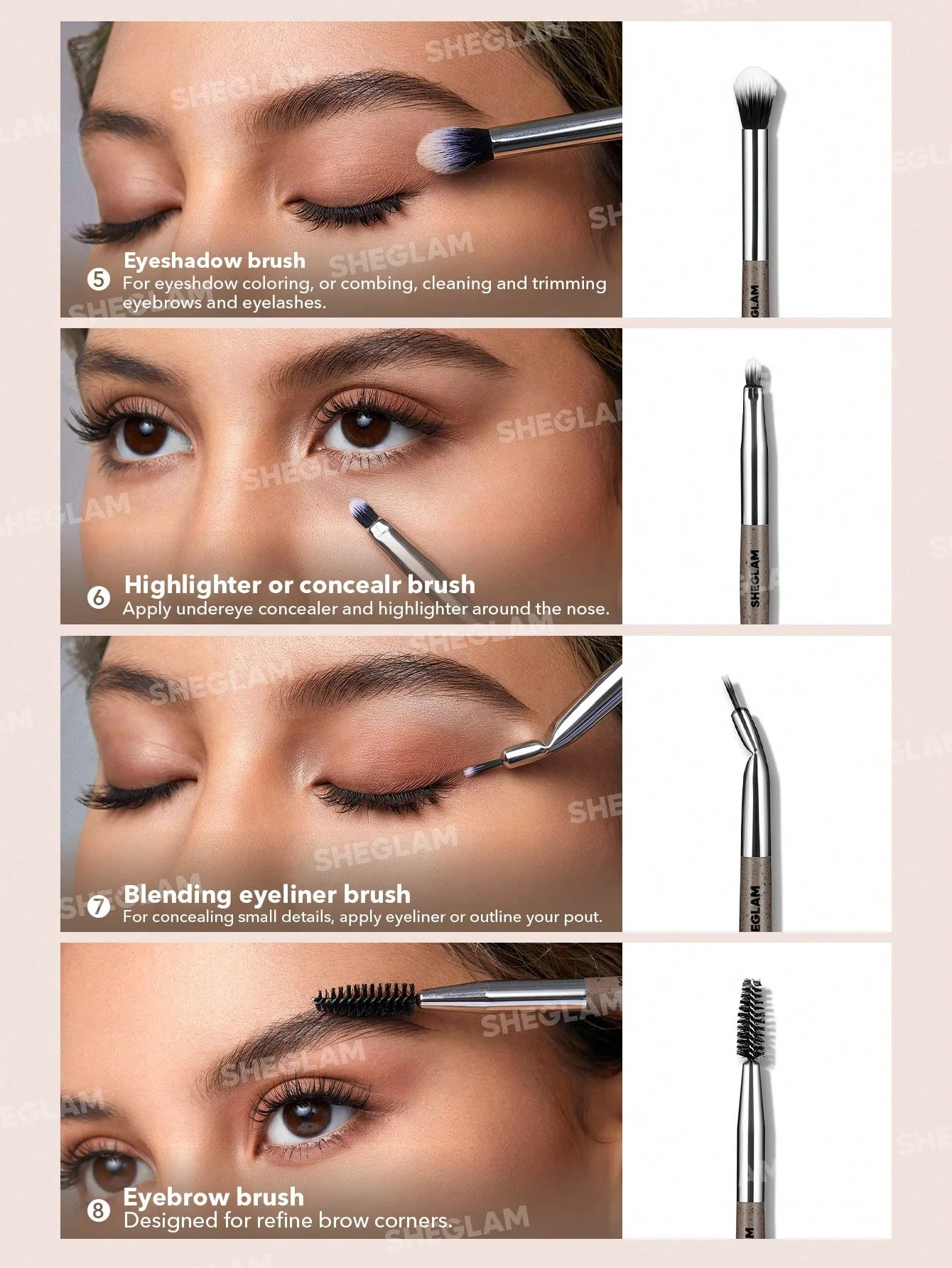 برای استفاده از ست براشهای Sheglam Glam Fam Brush Set، مراحل زیر را دنبال کنید: