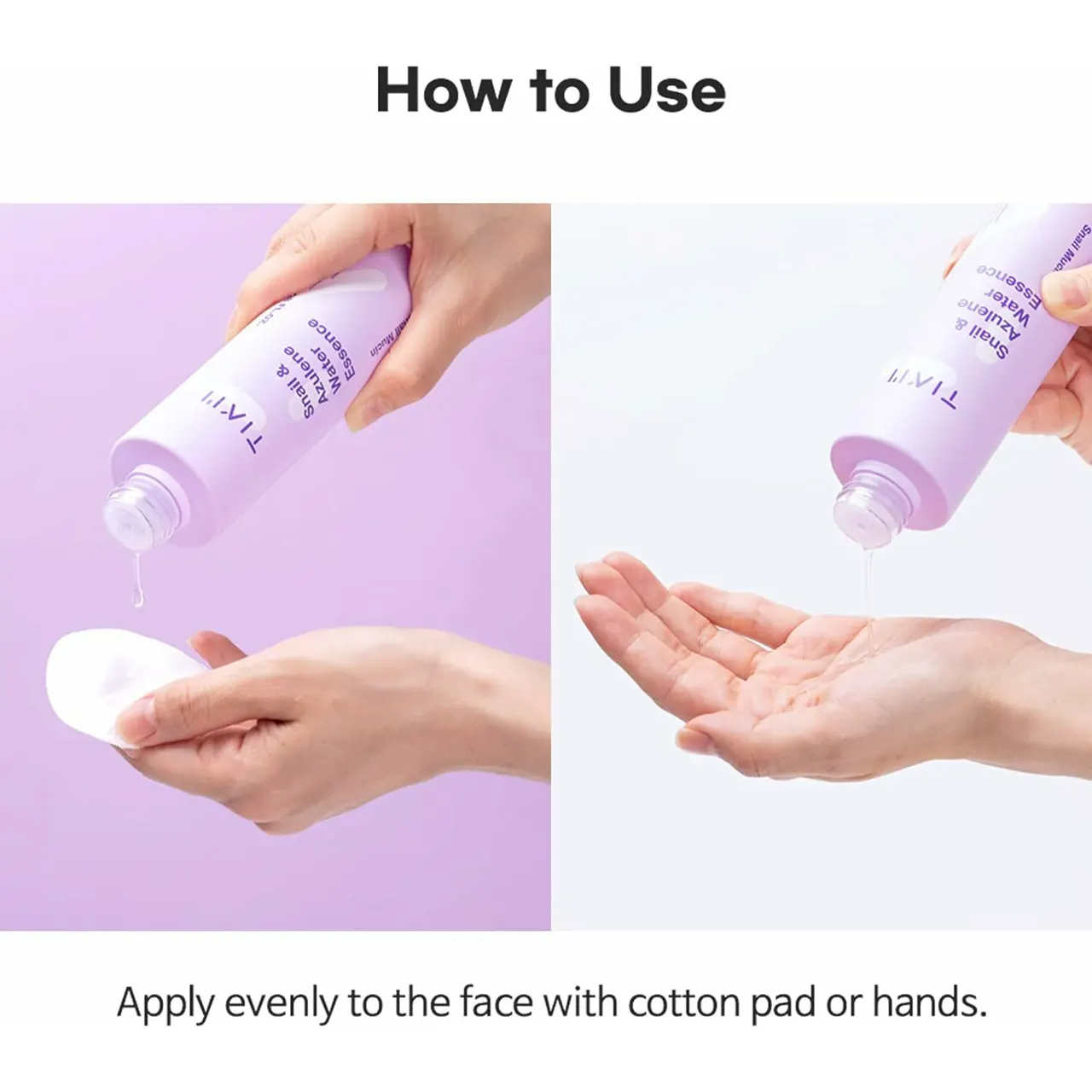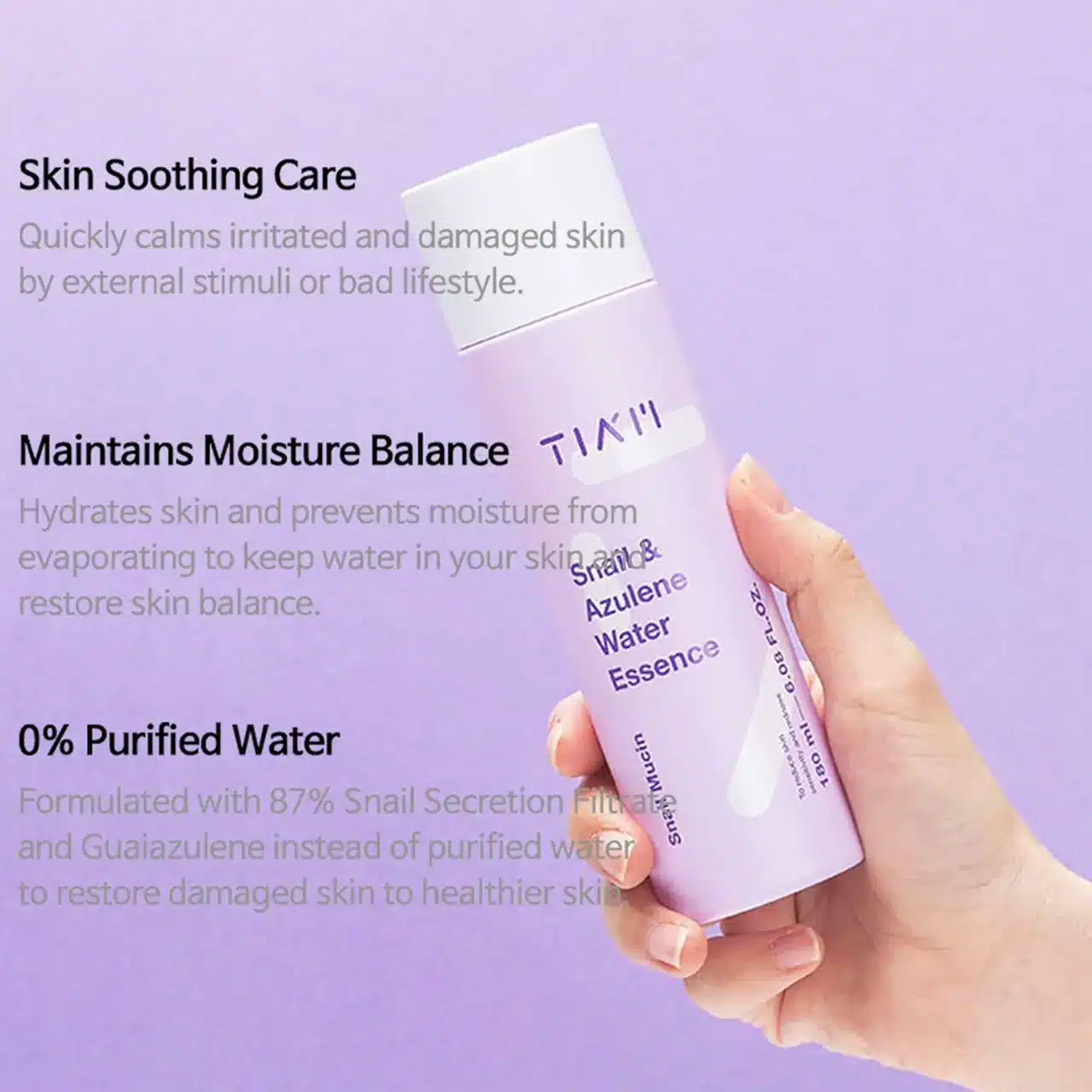 محصولات آبرسان و مرطوب کننده با عصاره حلزون و آب آزولن به عنوان یکی از بهترین راه حل ها برای مراقبت از پوست شناخته شده اند. اسنس (تونر) آبرسان حلزون و آب آزولن تیام دارای خواص تغذیهای و مرطوب کننده قوی هست که به بهبود وضعیت پوست کمک میکند. عصاره حلزون، که حاوی عناصر مغذی و ویتامین های مفیدی است، باعث تسکین پوست حساس و تحریک شده میشود و بهبود خاصیت ارتجاعی پوست را تقویت میکند. همچنین، از خشکی پوست جلوگیری کرده و محافظت از پوست در مقابل آسیب های ناشی از نور مکرر خورشید را فراهم میکند.